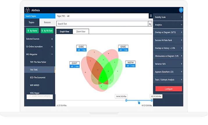 Aletheia is a data-driven & time-series application, wherein the collected data is represented in a circular and oval Venn diagrams and is very interactive. The graph resizing and change of colors happen in real-time depending on the density of data. Users can also zoom in from graph mode to data segment and pay careful attention to all the details. This helps the end-users make profitable decisions quickly.